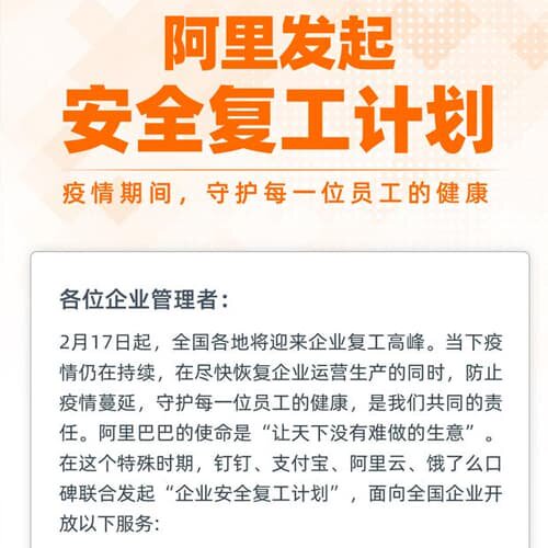 发布者:新浪科技 2020/02/15阿里巴巴旗下钉钉、支付宝、阿里云、饿了么口碑联合发起了一项企业安全复工计划,包含复工申请、员工健康管理、无接触办公、企业送餐等7项服务,以帮助企业安全有序复工。